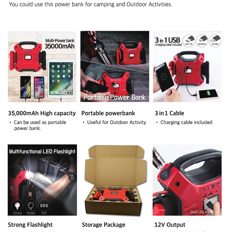 This is the only jump starter you will ever need. It is capable of jump starting 12V and 24V vehicles. With an auto-sensing feature that automatically detects the battery voltage, it has a peak current of 1200A from the 35,000mAh Lithium-Polymer Battery that is capable of jump starting trucks, buses, 4WD's, vans, bikes, cars, boats, jet ski's, or anything you throw at it. With its big capacity A grade lithium polymer battery, it is able to jump start your vehicle multiple times.
