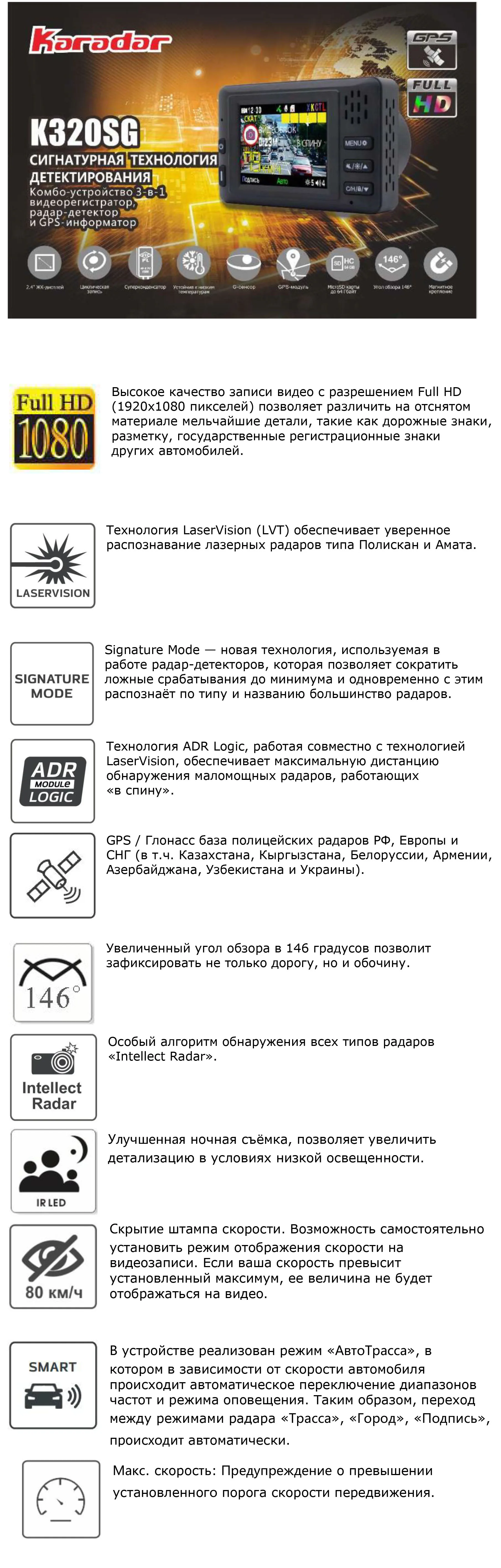 Поздравляем Вас с приобретением Karadar Combo K320SG, которое совмещает в себе два устройства - сигнатурный радар-детектор с