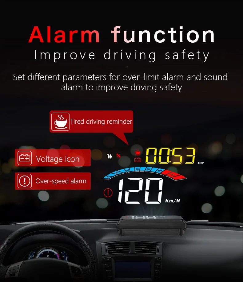 HUD short for Head Up Display,the main function is to display the car dashboard information (e.g.speed,RPM,water temperature,voltage,trip distance etc ),and keep the driver eyes always on road to avoid the dangerous of lowering down head to read the dashboard.