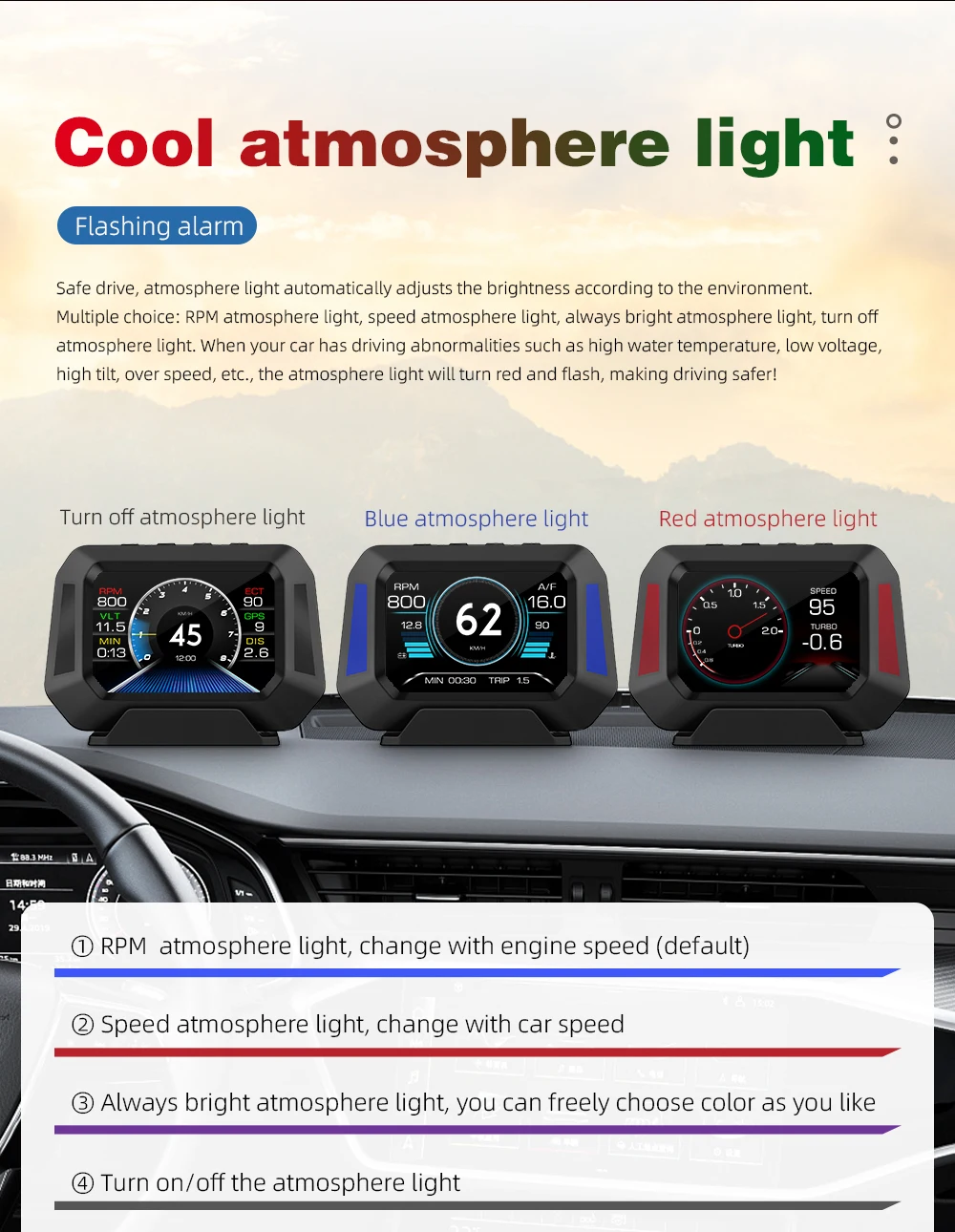 The brightness of the display can be adjusted automatically so that it is always clear and beautiful. It is clearly visible on sunny or rainy days, or late at night and in tunnels.