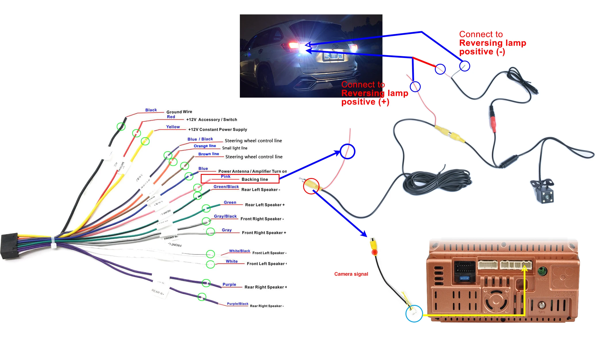 5. Reversing rear view function: support fast reversing, switch to reversing state within 2 seconds of turning on reverse gear, and within 5 seconds of turning off state. The pink color of the tail line is the reversing detection line, which needs to be connected to the reversing light or the reverse gear output 12V, the wrong connection will lead to abnormal reversing function.