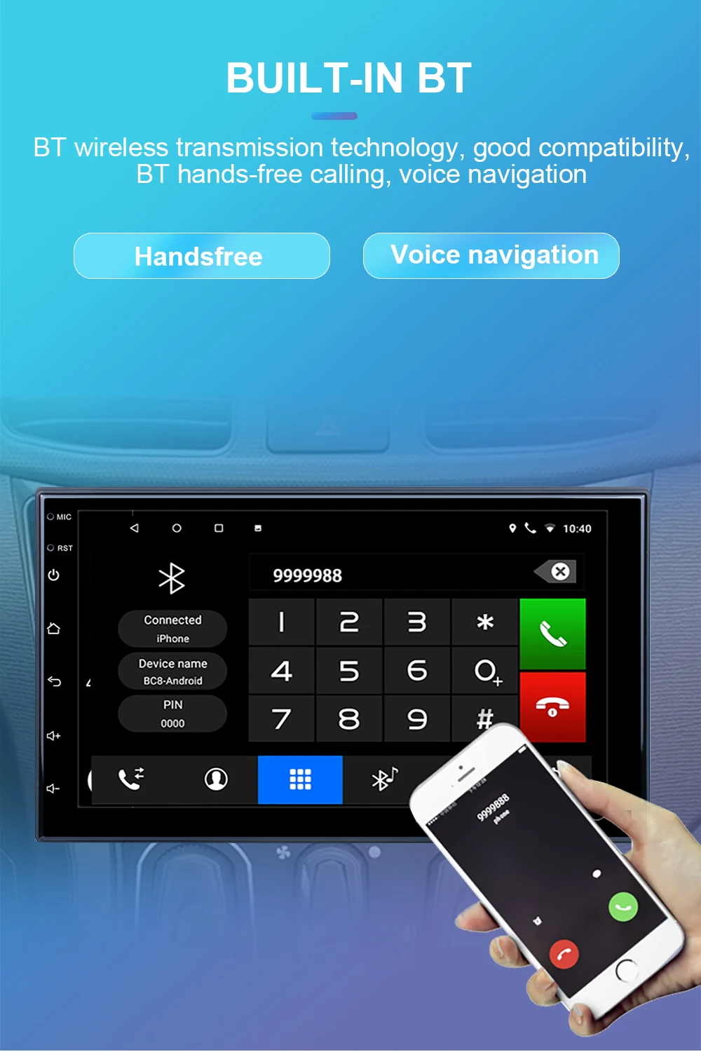 5. Built-in Bluetooth, phonebook and BT music;